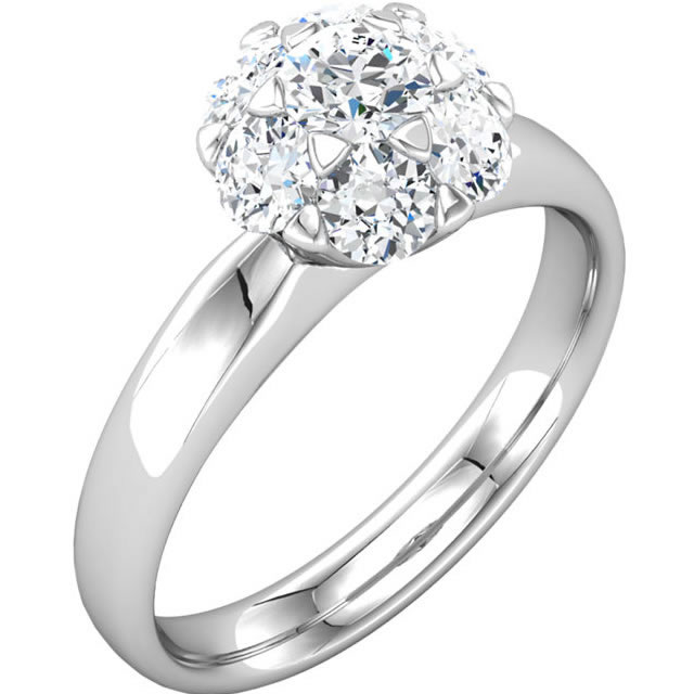 One 18K white gold, 7 diamond cluster engagement ring with 1.20ct total diamond weight. Center diamond is 0.33ct and graded as VS2 in clarity H in color.