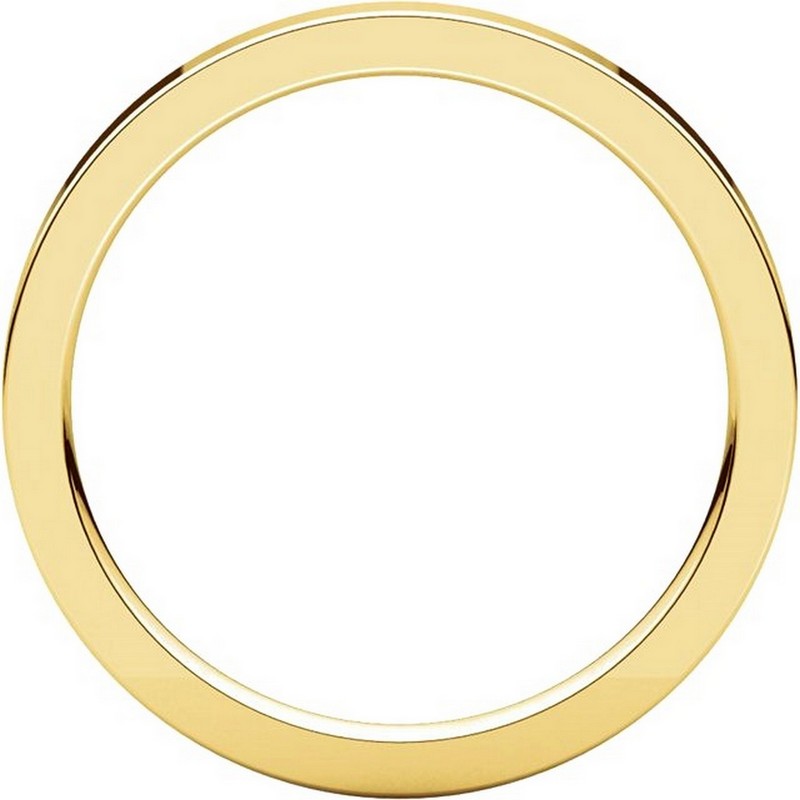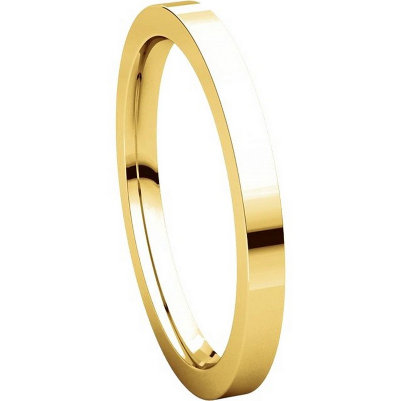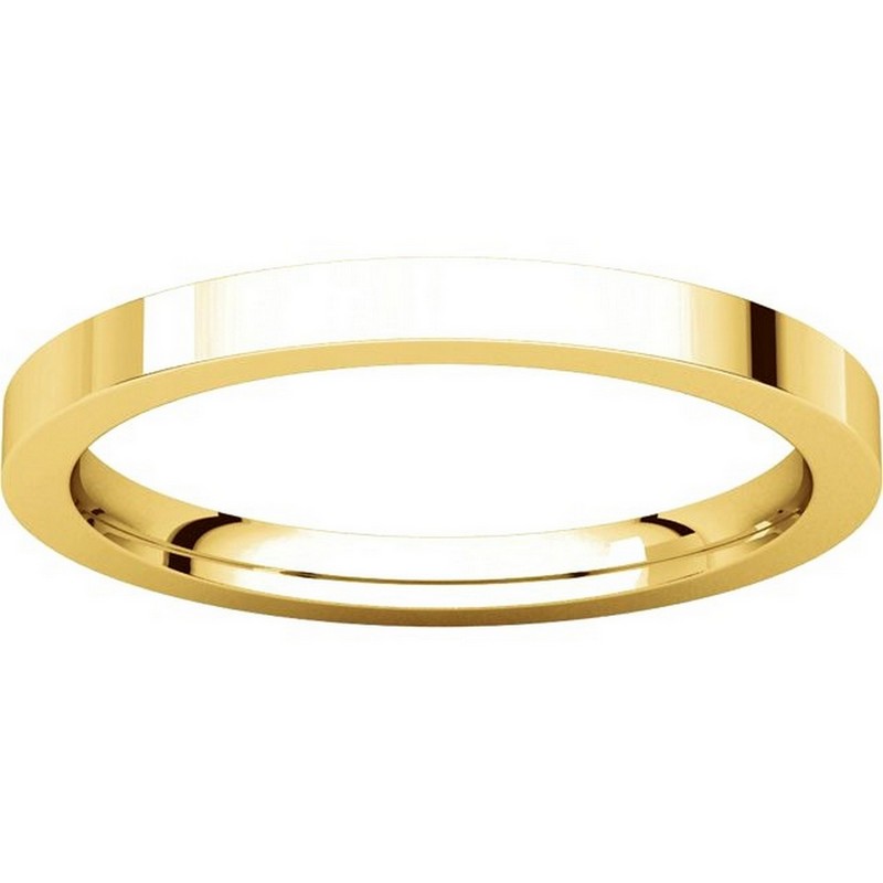 18 kt gold plain 2.0 mm wide flat comfort fit wedding band. The ring is a polished finish. Different finishes may be selected or specified.
