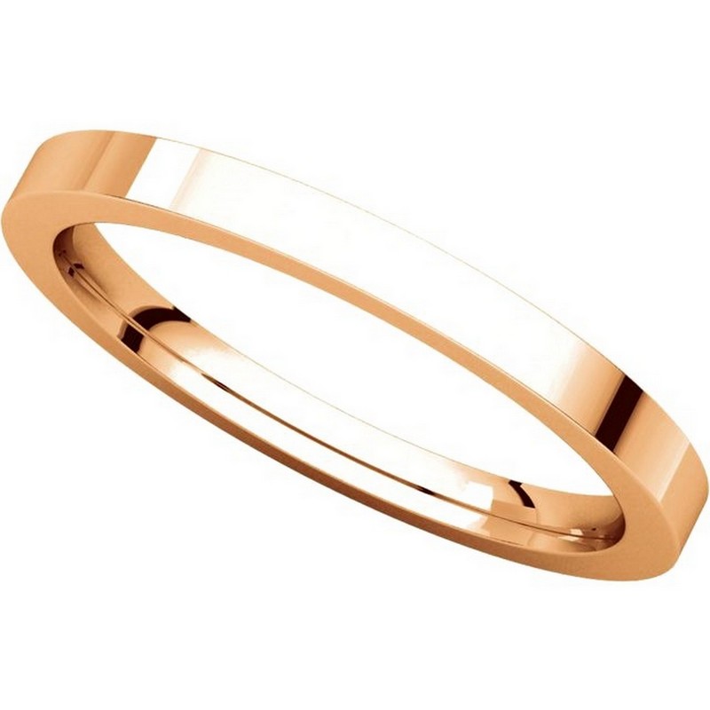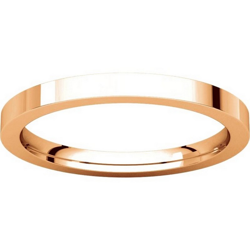 18 kt Rose gold plain 2.0 mm wide flat comfort fit wedding band. The ring is a polished finish. Different finishes may be selected or specified.