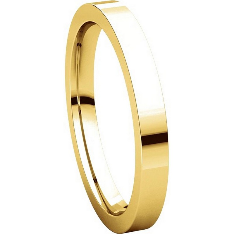 14 kt gold plain 2.5 mm wide flat comfort fit wedding band. The ring is a polished finish. Different finishes may be selected or specified.