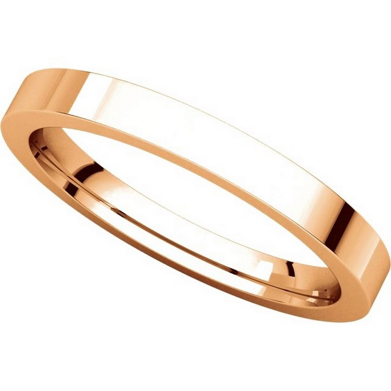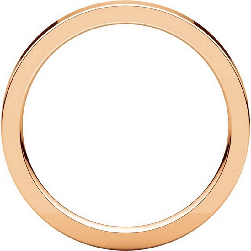 14 kt Rose gold plain 2.5 mm wide flat comfort fit wedding band. The ring is a polished finish. Different finishes may be selected or specified.