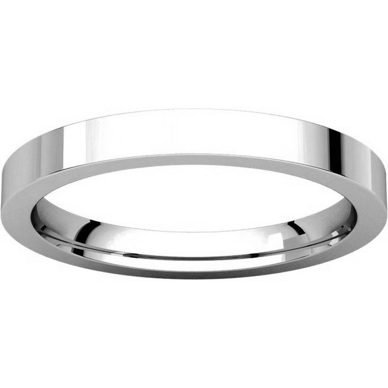 18 kt white gold plain 2.5 mm wide flat comfort fit wedding band. The ring is a polished finish. Different finishes may be selected or specified.