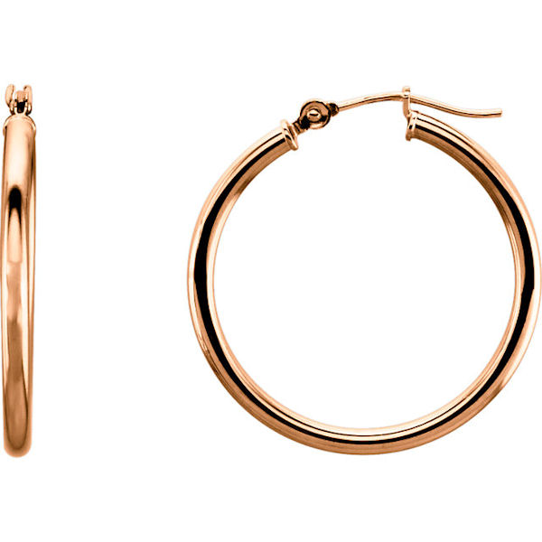 14kt rose gold hoop earrings with a hinge. The earrings are 25 mm in size.