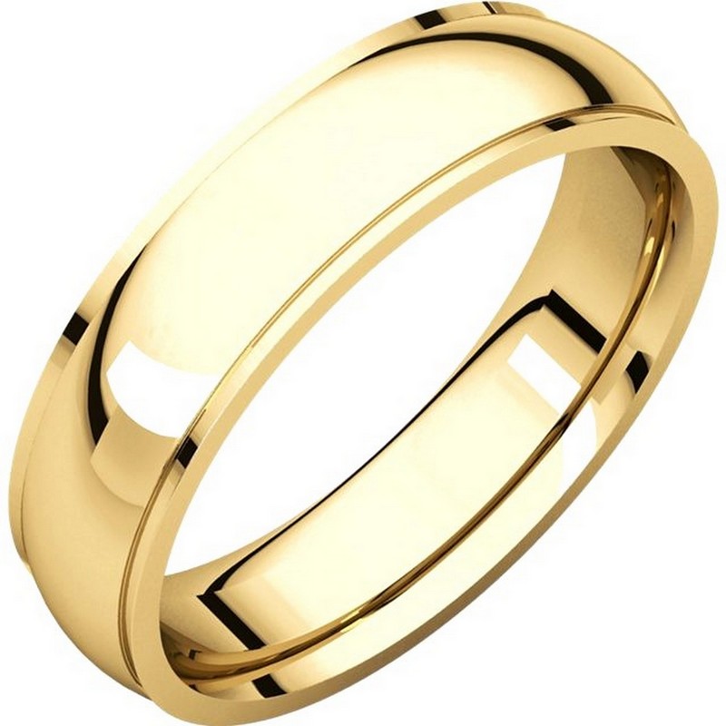 14K yellow gold comfort fit 5.0 mm wide wedding band with defined edge. The finish on the wedding ring is polished. Other finishes may be selected or specified.