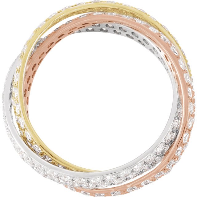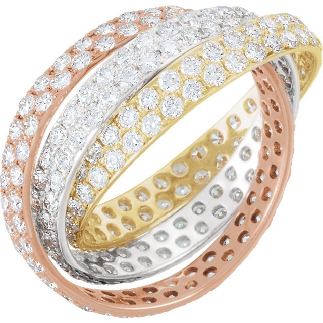 14K tri-color rolling three band diamond eternity band. Diamonds total weight in size 6.0 is approximately 3.3ct. The diamonds are graded VS in clarity G-H in color.