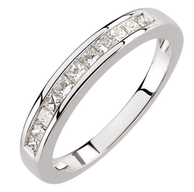 18K white gold, diamond anniversary ring. The ring has 11 princess cut diamonds with total weight of 0.50ct. The diamonds are graded as VS in clarity G-H in color.