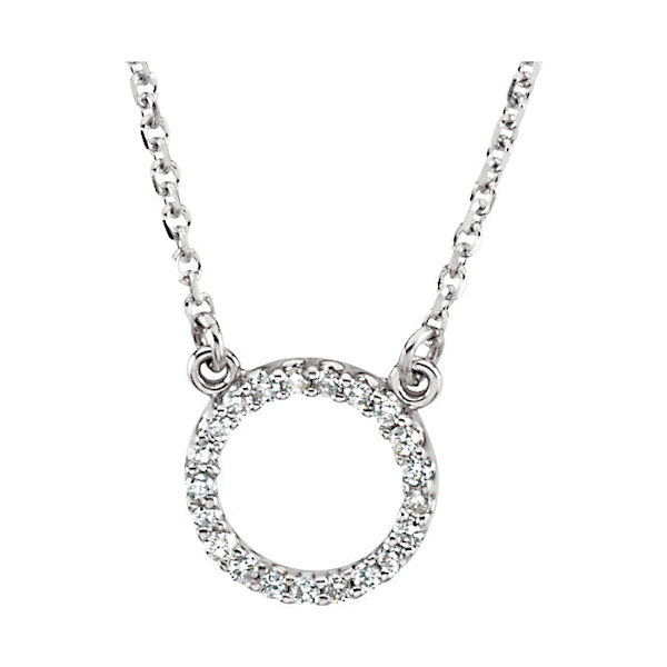 14kt white gold, 0.10 ct tw diamond, SI1-2 in clarity and G-H in color, diamond circle necklace. The pendant hangs on a 16" inch link chain.