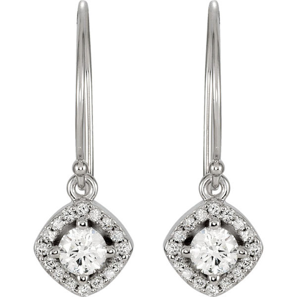 14kt white gold, diamond, dangle halo earrings. The diamonds are about 0.375 ct tw, SI1-2 in clarity and G-H in color.