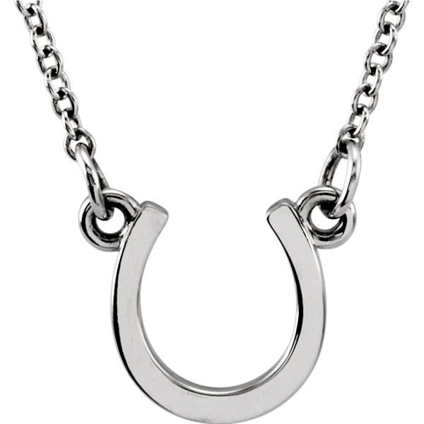 14kt white gold, horseshoe pendant measuring about 10x9mm in size that hangs on an 18" inch link chain.