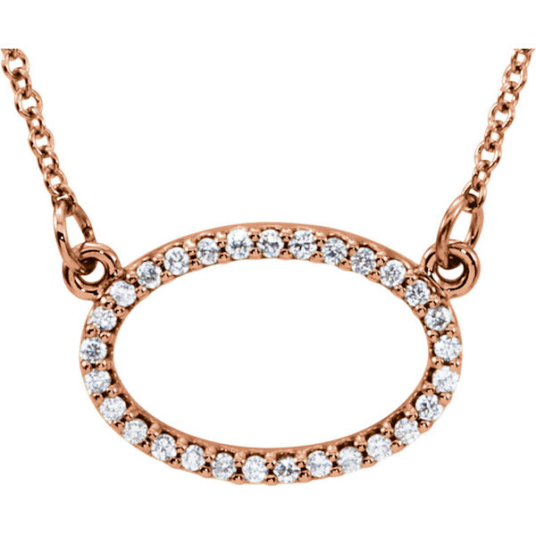 14kt rose gold, 0.166 ct tw diamond, SI1-2 in clarity and G-H in color, oval pendant. The pendant hangs on a 16" inch link chain.