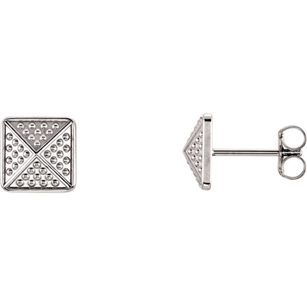 14kt white gold, granulated pyramid earrings. The size of the earring is 10x10 mm in size.
