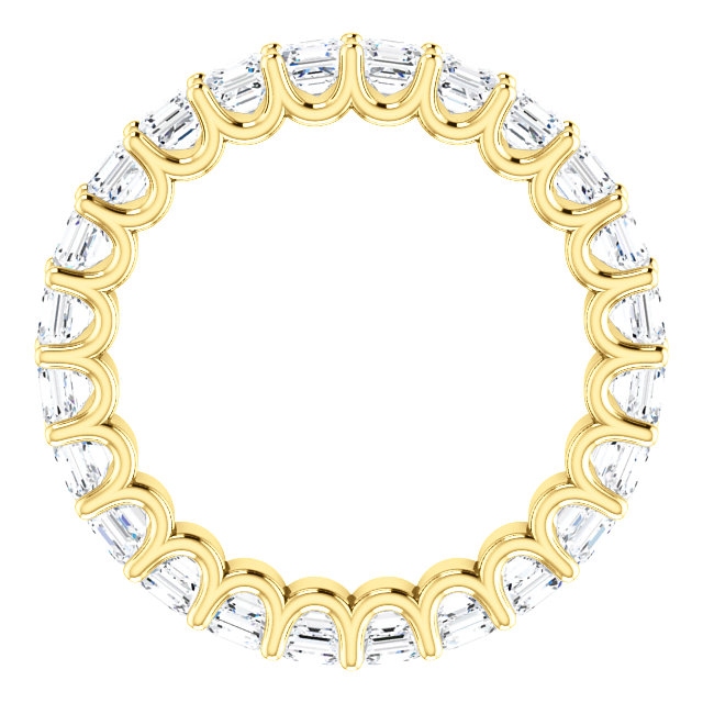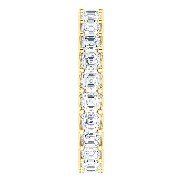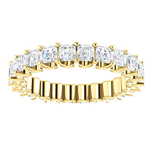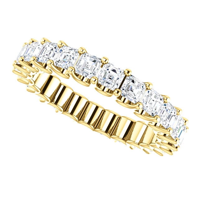 Eternal-Love eternity band in 14K yellow gold. The band holds 24 Asscher cut brilliant diamonds with total weight of 2.4CT. The diamonds are graded as minimum H in color and VS in clarity.
