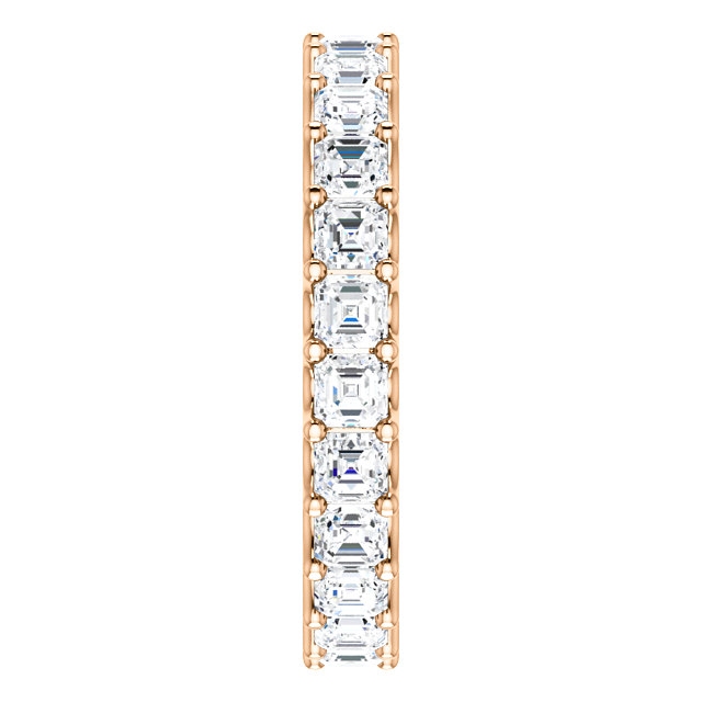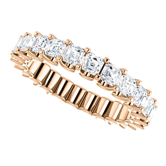 Eternal-Love eternity band in 14K rose gold. The band holds 24 Asscher cut brilliant diamonds with total weight of 2.4CT. The diamonds are graded as minimum H in color and VS in clarity.