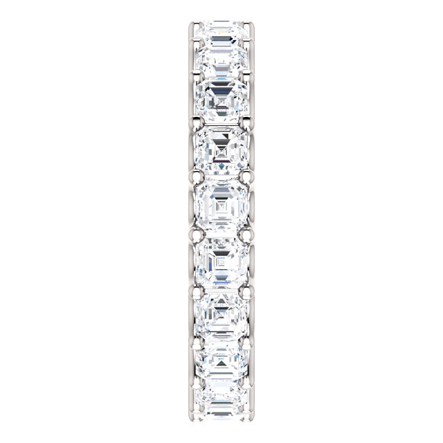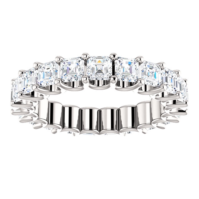 Eternal-Love eternity band in platinum. The band holds 21 Asscher cut brilliant diamonds with total weight of 3.4CT. The diamonds are graded as minimum H in color and VS in clarity.