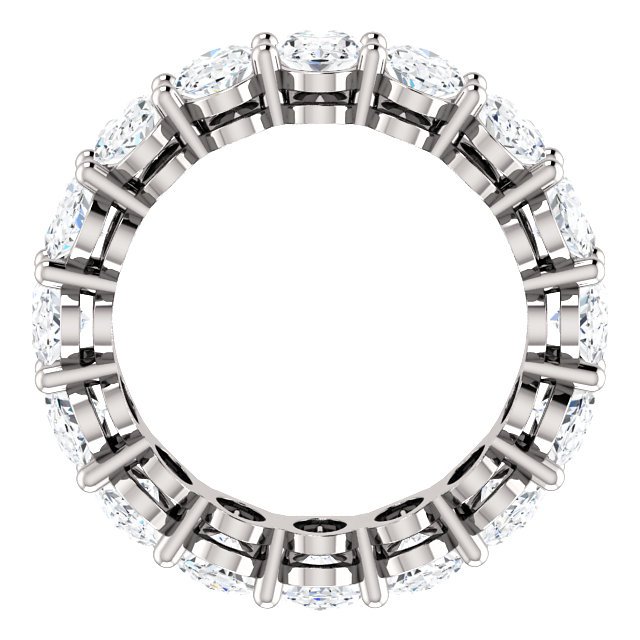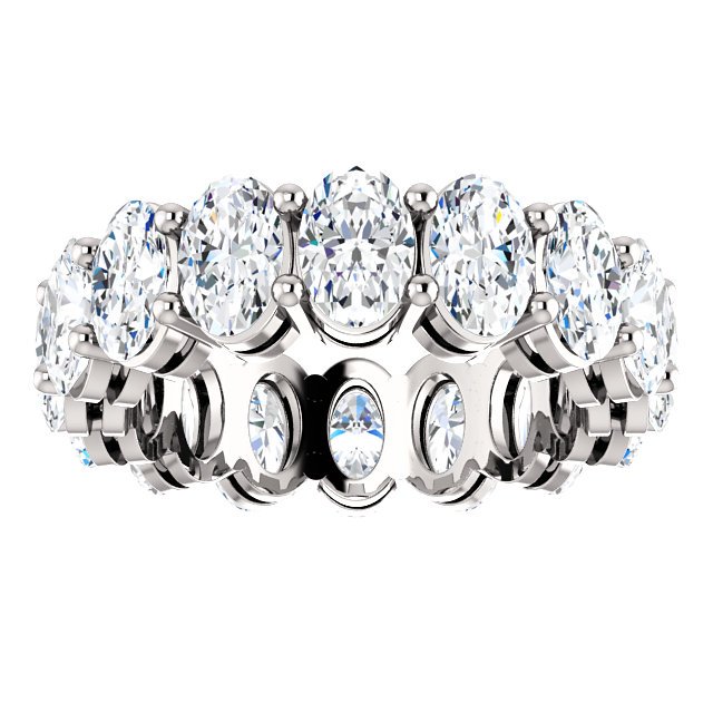 Platinum diamond eternity band. The band in size 6.0 holds 16 matching oval shape brilliant diamonds each measuring 6.0X4.0mm. The diamonds together weigh approximately 8.0ct in size 6.0. The diamonds are graded as VS1 in clarity G in color.