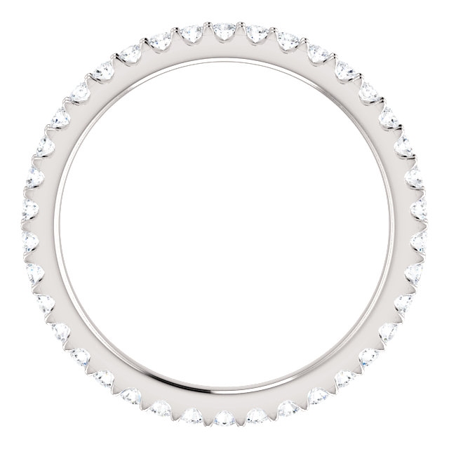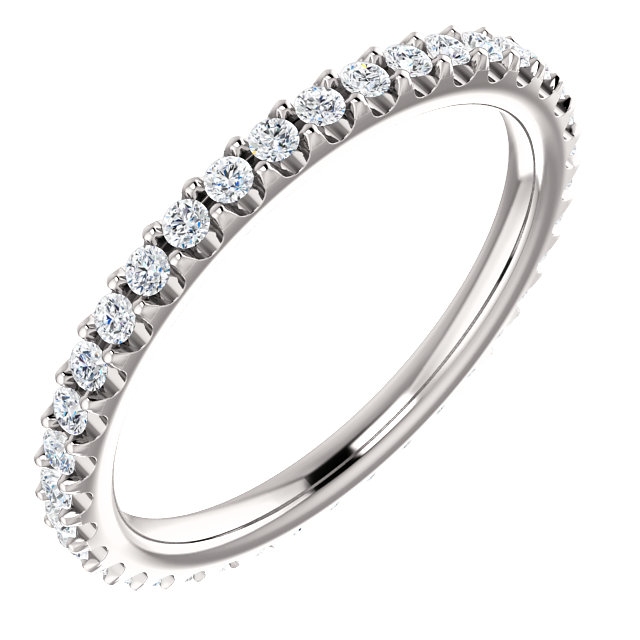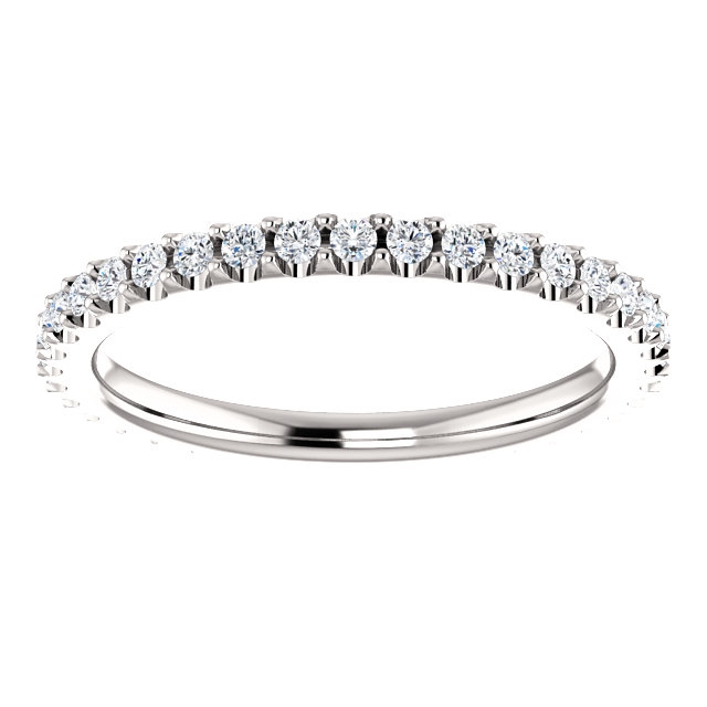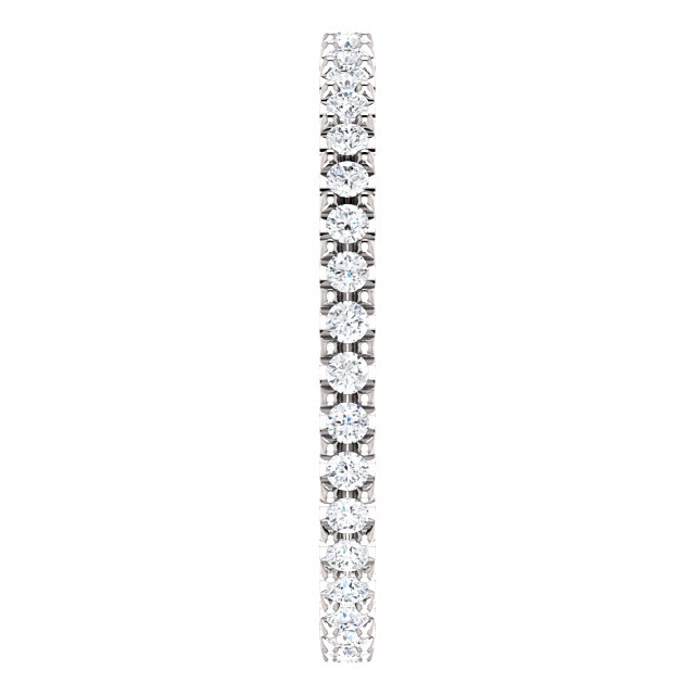 14K white gold diamond eternity band. The ring in size 6.0 holds approximately 41 round brilliant cut diamonds with total weight of 0.38ct. The diamonds are graded as VS in clarity G-H in color.