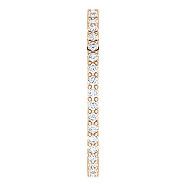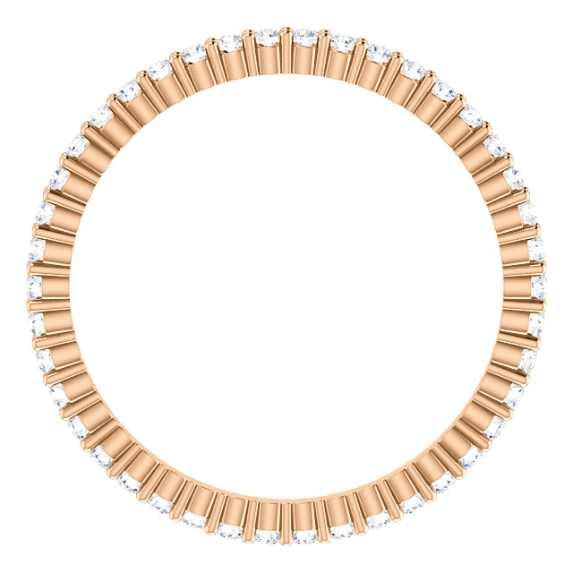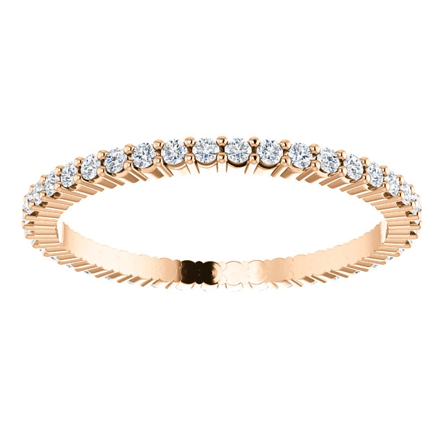 14K rose gold eternity band. The band in size 6.0 holds 40 round brilliant cut diamonds with total weight of approximately 0.38ct. The diamonds are graded as VS in clarity G-H in color.