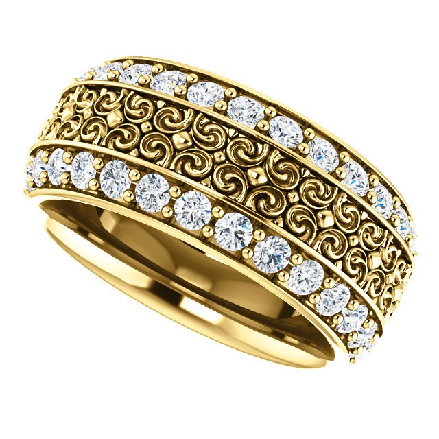 Diamond eternity band made in 14K yellow gold with 56 round cut brilliant diamonds weighing together approximately 1.68ct in size 7. The diamonds are graded as VS in clarity G-H in color.