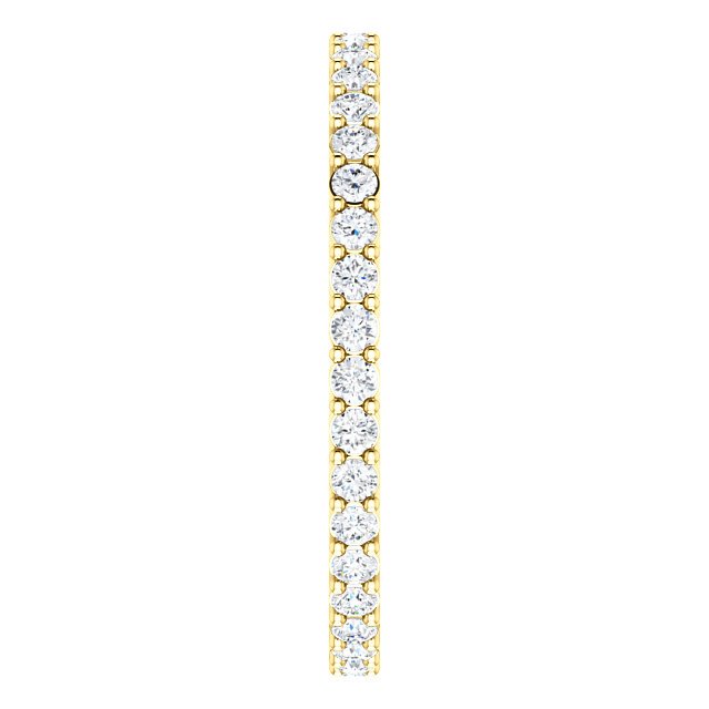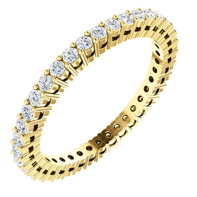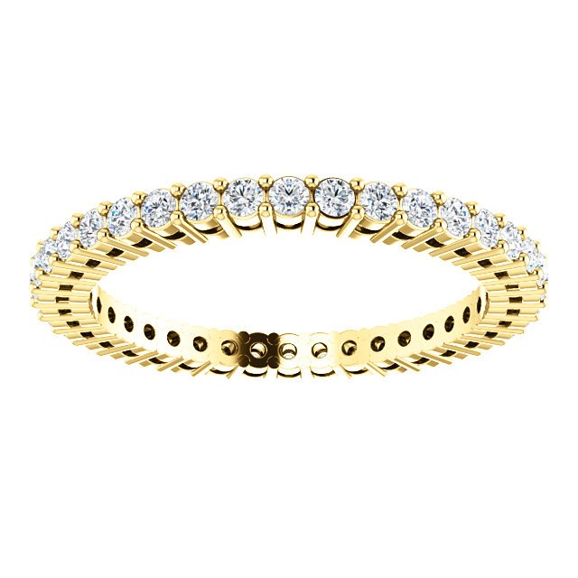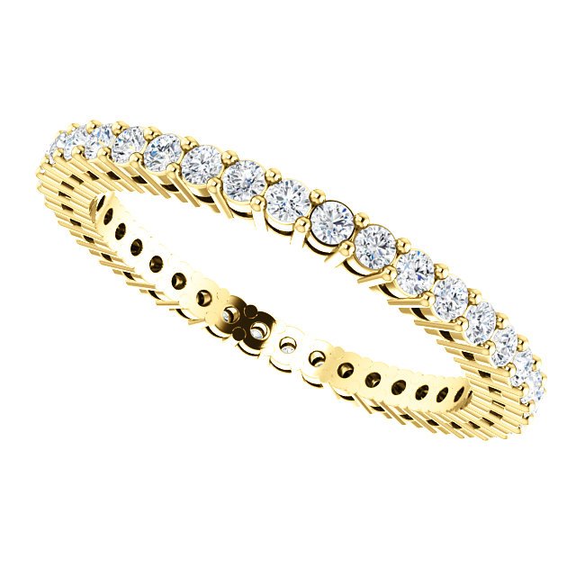 14K yellow gold diamond eternity band. the ring in size 6.0 holds approximately 39 round brilliant cut diamonds with total weight of 0.50ct. The diamonds are graded as SI in clarity G-H in color.