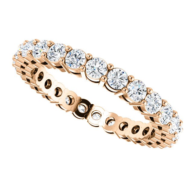 14K rose gold diamond eternity band. The ring in size 6.0 holds approximately 26 round brilliant cut diamonds with total weight of 1.0ct. The diamonds are graded as VS in clarity G-H in color.