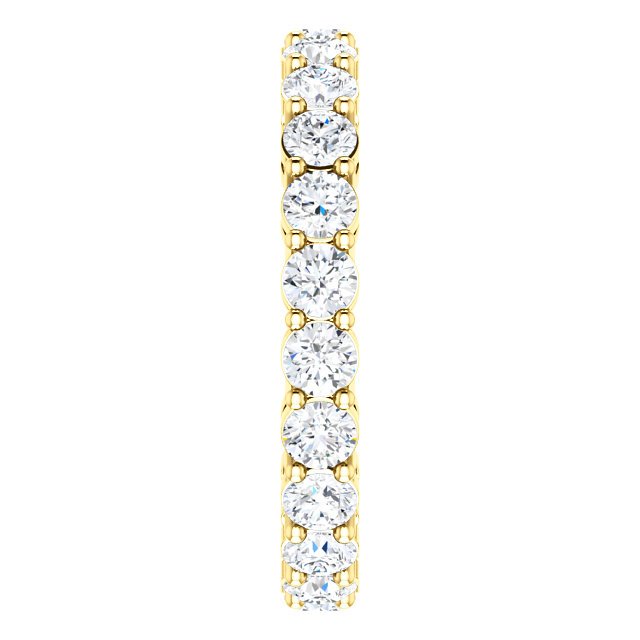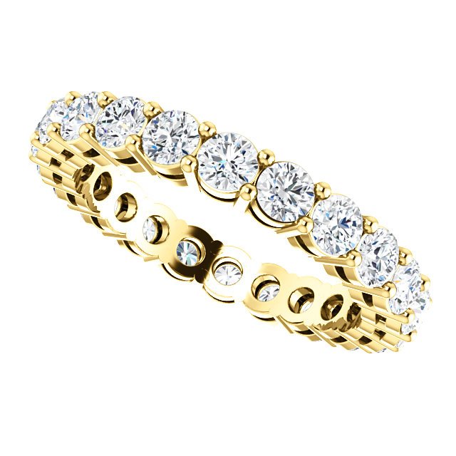 14K yellow gold diamond eternity band. The ring holds 22 round brilliant cut diamonds with total weight of approximately 1.75ct. The diamonds are graded as VS in clarity G-H in color.