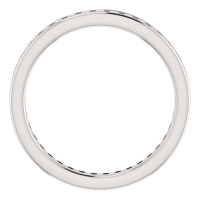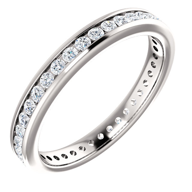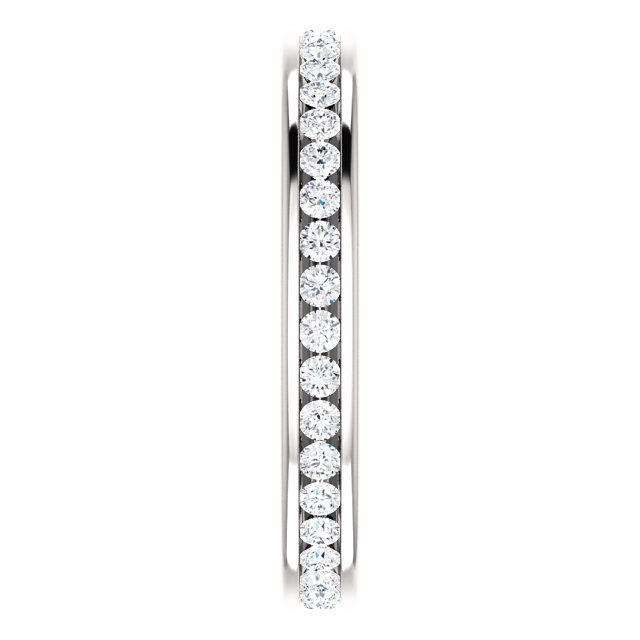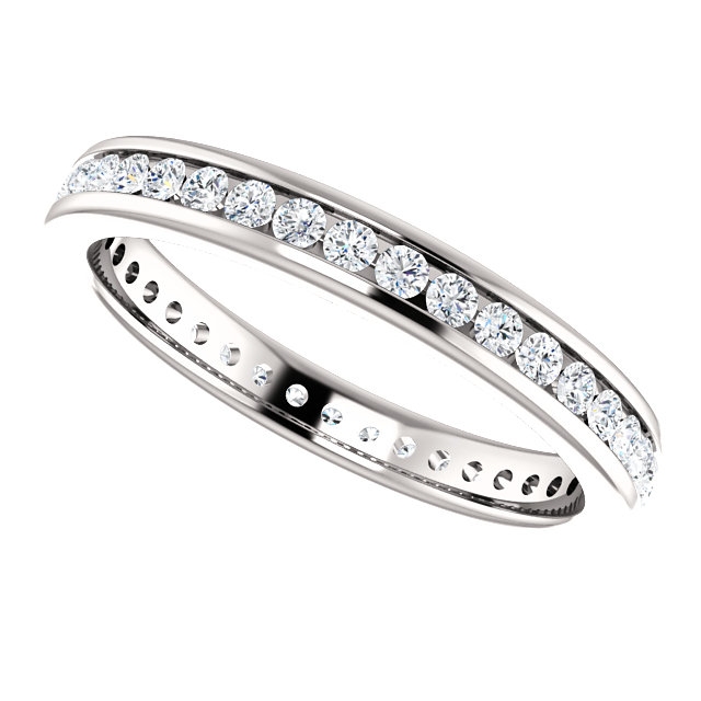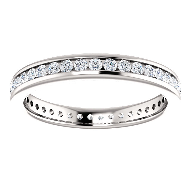 14Kt White gold eternity ring. The ring holds 46 round brilliant cut diamonds, each measures 1.4 mm. The diamonds are approximately 0.50ct tw in size 6.0, SI in clarity, very clean and G-H in color. The diamonds are channel set.