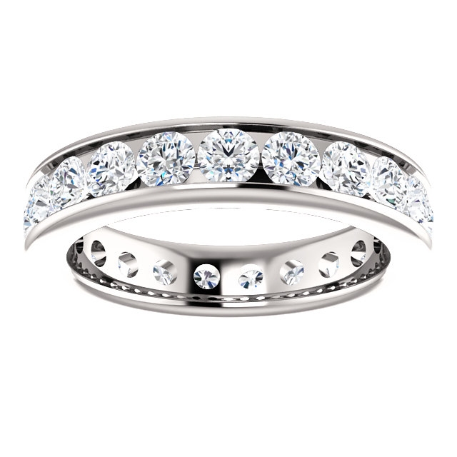 18Kt White gold eternity ring. The ring holds 21 round brilliant cut diamonds, each measures 3.0 mm. The diamonds are approximately 2.10 ct tw, VS1-2 in clarity, very clean and G-H in color, near colorless to colorless. The diamonds are channel set. There may be more diamonds in larger ring sizes. The band is about 4.3mm wide. The finish is polished. Different finishes may be selected.