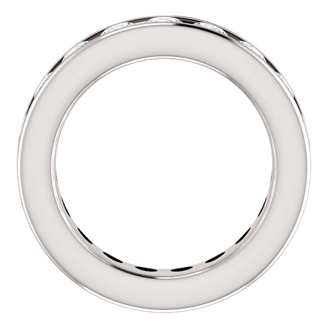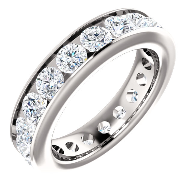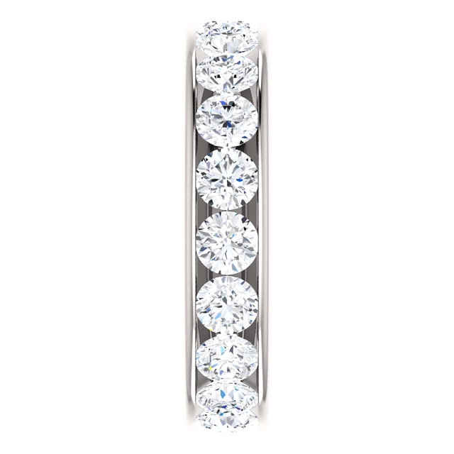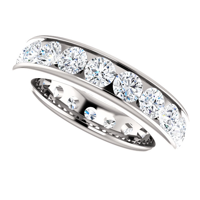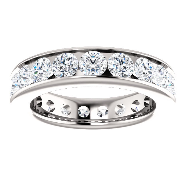 Platinum eternity ring. The ring holds 19 round brilliant cut diamonds, each measures 3.5 mm. The diamonds total weight is approximately 2.85 ct, in size 6.0. VS1-2 in clarity, very clean and G-H in color, near colorless to colorless. The diamonds are channel set. There may be more diamonds in larger ring sizes. The band is about 4.8mm wide.
