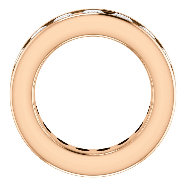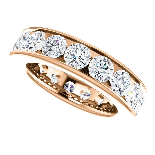 18K rose gold eternity band. The ring holds 17 round brilliant cut diamonds, each measures 4.1mm. The diamonds total weight is approximately4.50ct, in size 6.0. VS1-2 in clarity, very clean and G-H in color, near colorless to colorless. The diamonds are channel set. There may be more diamonds in larger ring sizes. The band is about 5.4mm wide.