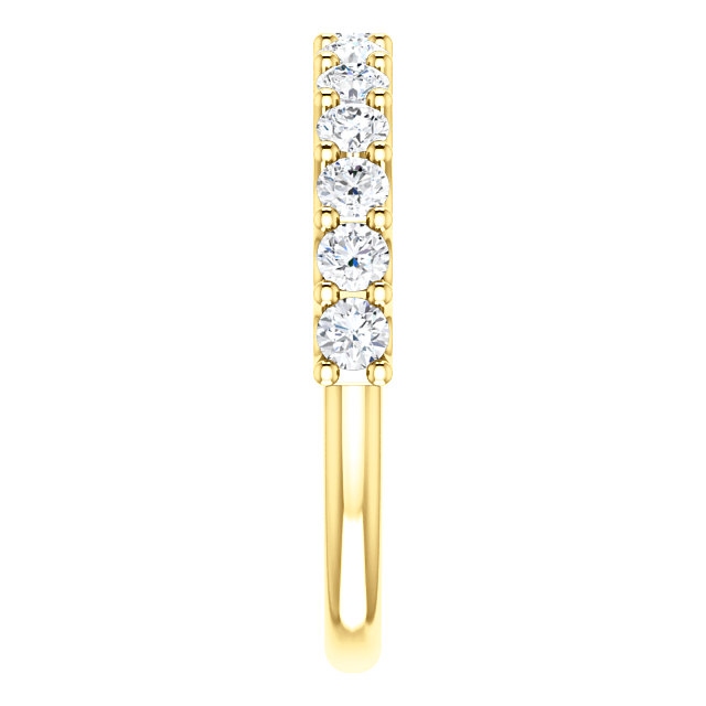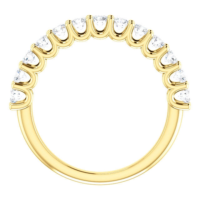Eternal-Love 18K gold anniversary band. the ring holds 13 round brilliant diamonds with total weight of 0.75ct. The diamonds are graded as SI1 in clarity G-H in color.