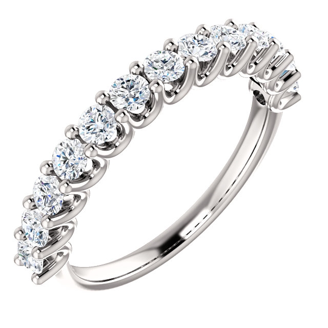 Eternal-Love 14K white gold anniversary band. the ring holds 13 round brilliant diamonds with total weight of 0.75ct. The diamonds are graded as SI1 in clarity G-H in color.