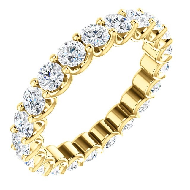 Eternal-Love diamond eternity band in 14K yellow gold. Diamonds are set in shared prongs with a draped side profile displays an endless row of floating round brilliant-cut diamonds. The diamond total weight is approximately 2.10ct in size 6.0.