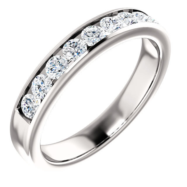One 18K white gold 9 diamonds wedding band. Diamonds together weigh 1.0ct. The diamonds are all matching channel set and are graded as VS inclarity G-H in color