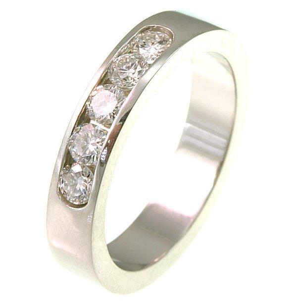 Platinum, comfort fit 4.0 mm wide diamond anniversary band. Diamond total weight is 0.50 ct and diamonds are graded VS1-2 in clarity G-H in color. The finish on the ring is polished. Other finishes may be selected or specified.