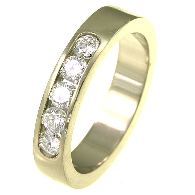 18K yellow gold, comfort fit, 4.0 mm wide diamond wedding band. Diamonds total weight is 0.50 ct. The diamonds are graded as VS1-2 in clarity G-H in color. The finish on the ring is polished. Other finishes may be selected or specified.