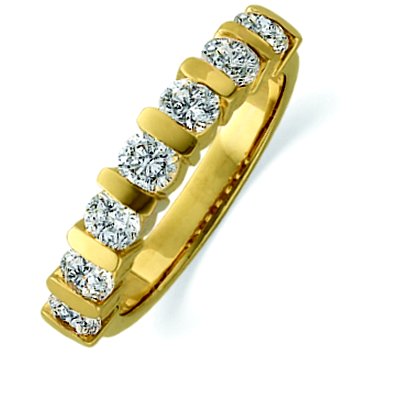 18 K yellow gold, 3.5 mm wide, anniversary band, holds 7 brilliant cut diamonds with total weight of approximately 1.0 ct. Diamonds are graded as VS1-2 in clarity G-H in color. The finish on the ring is polished. Other finishes may be selected or specified.