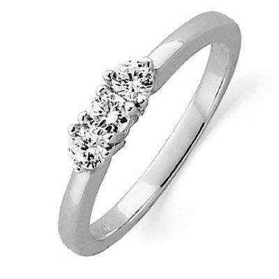 Platinum ring holds three round brilliant cut diamonds with total weight 0.25 ct. The diamonds are graded as VS1-2 in clarity G-H in color. The finish on the ring is polished. Other finishes may be selected or specified.