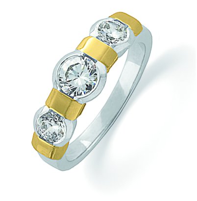 14 K white and yellow gold ring holds three round brilliant cut diamonds with total weight 0.50 ct. The diamonds are graded as VS1-2 in clarity G-H in color. The finish on the ring is polished. Other finishes may be selected or specified.