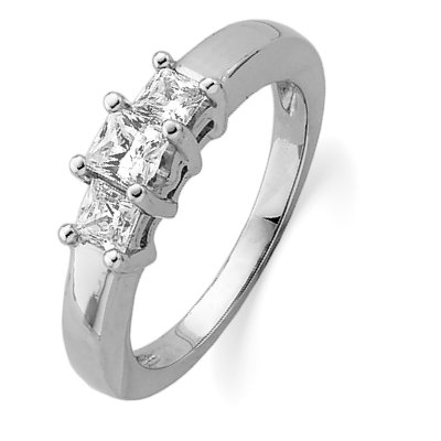14 K white gold three princess cut brilliant diamond anniversary band. The diamond total weight is approximately 1.0 ct. The diamonds are graded as VS1-2 in clarity G-H in color. The finish on the ring is polished. Other finishes may be selected or specified.