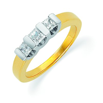 14 K white and yellow gold three princess cut brilliant diamond anniversary band. The diamond total weight is approximately 0.50 ct. The diamonds are graded as VS1-2 in clarity G-H in color. The finish on the ring is polished. Other finishes may be selected or specified.
