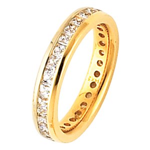 One 14 kt yellow gold eternity ring. Each diamond measures approximately 2.25mm and in size 6.0 the ring holds 27 princess cut brilliant diamonds. The diamonds total weight in size 6.0 is approximately 1.94 ct. The diamonds are graded as VS in clarity G-H in color.