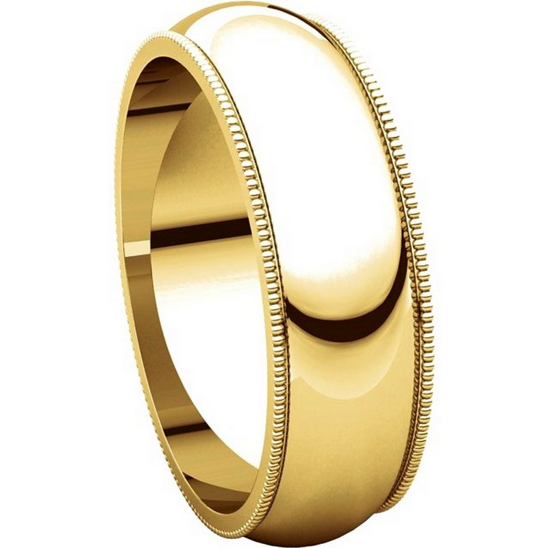 18K gold 6.0 mm wide comfort fit milgrain edge wedding band. The finish on the ring is polished. Other finishes may be selected or specified.