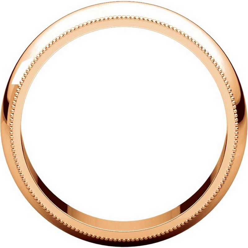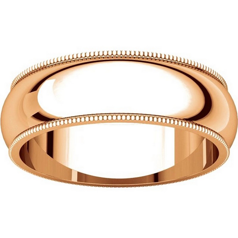 14K Rose gold 6.0 mm wide comfort fit milgrain edge wedding band. The finish on the ring is polished. Other finishes may be selected or specified.