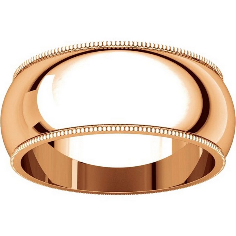 14K Rose gold, 8.0 mm wide, comfort fit, milgrain edge wedding band. The finish on the ring is polished. Other finishes may be selected or specified.