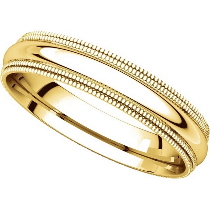 18K yellow gold 4.0 mm wide comfort fit double milgrain edge wedding band. The finish on the ring is polished. Other finishes may be selected or specified.