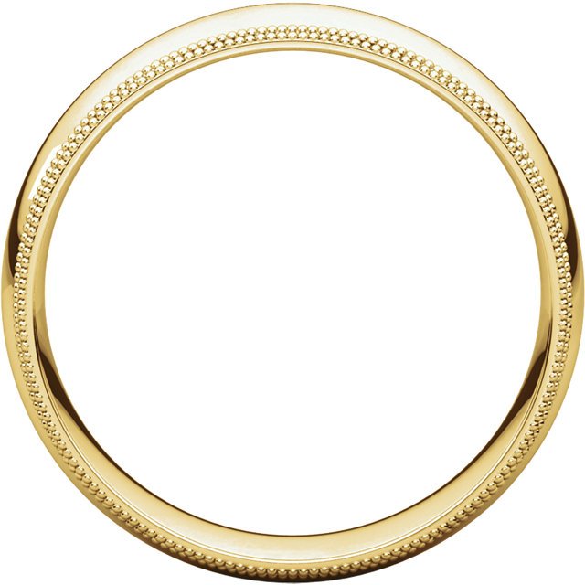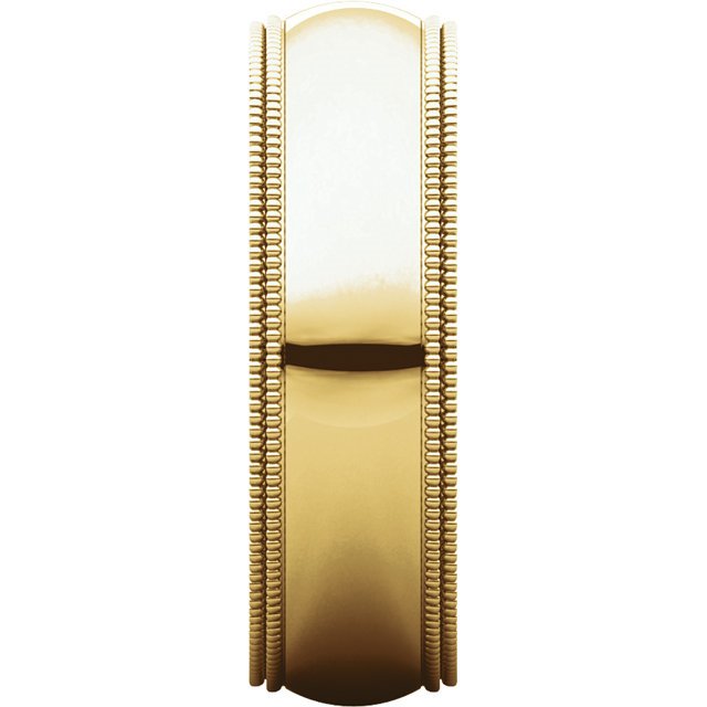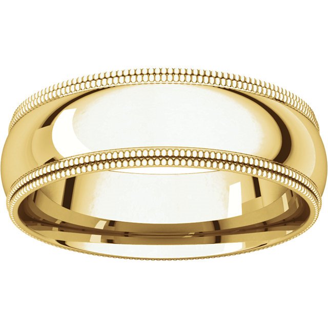 14K gold 6.0 mm wide comfort fit double milgrain edge wedding band. The finish on the ring is polished. Other finishes may be selected or specified.