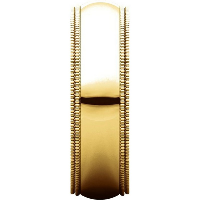 18K gold 6.0 mm wide comfort fit double milgrain edge wedding band. The finish on the ring is polished. Other finishes may be selected or specified.