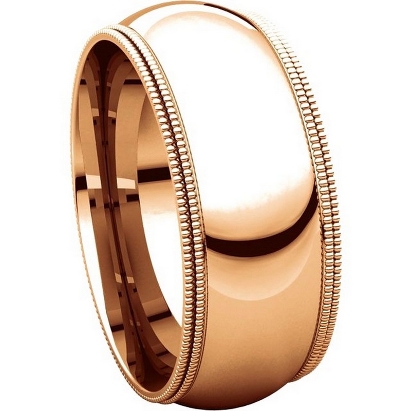 18K Rose gold 8.0 mm wide comfort fit double milgrain edge wedding band. The finish on the ring is polished. Other finishes may be selected or specified.