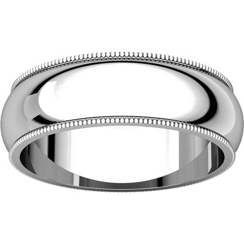 Platinum, 6.0 mm wide heavy comfort fit, milgrain edge wedding band. The finish on the ring is polished. Other finishes may be selected or specified.