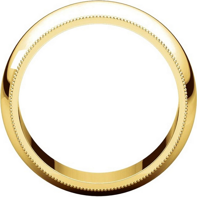 14 kt yellow gold, 8.0 mm wide heavy comfort fit, milgrain edge wedding band. The finish on the ring is polished. Other finishes may be selected or specified.